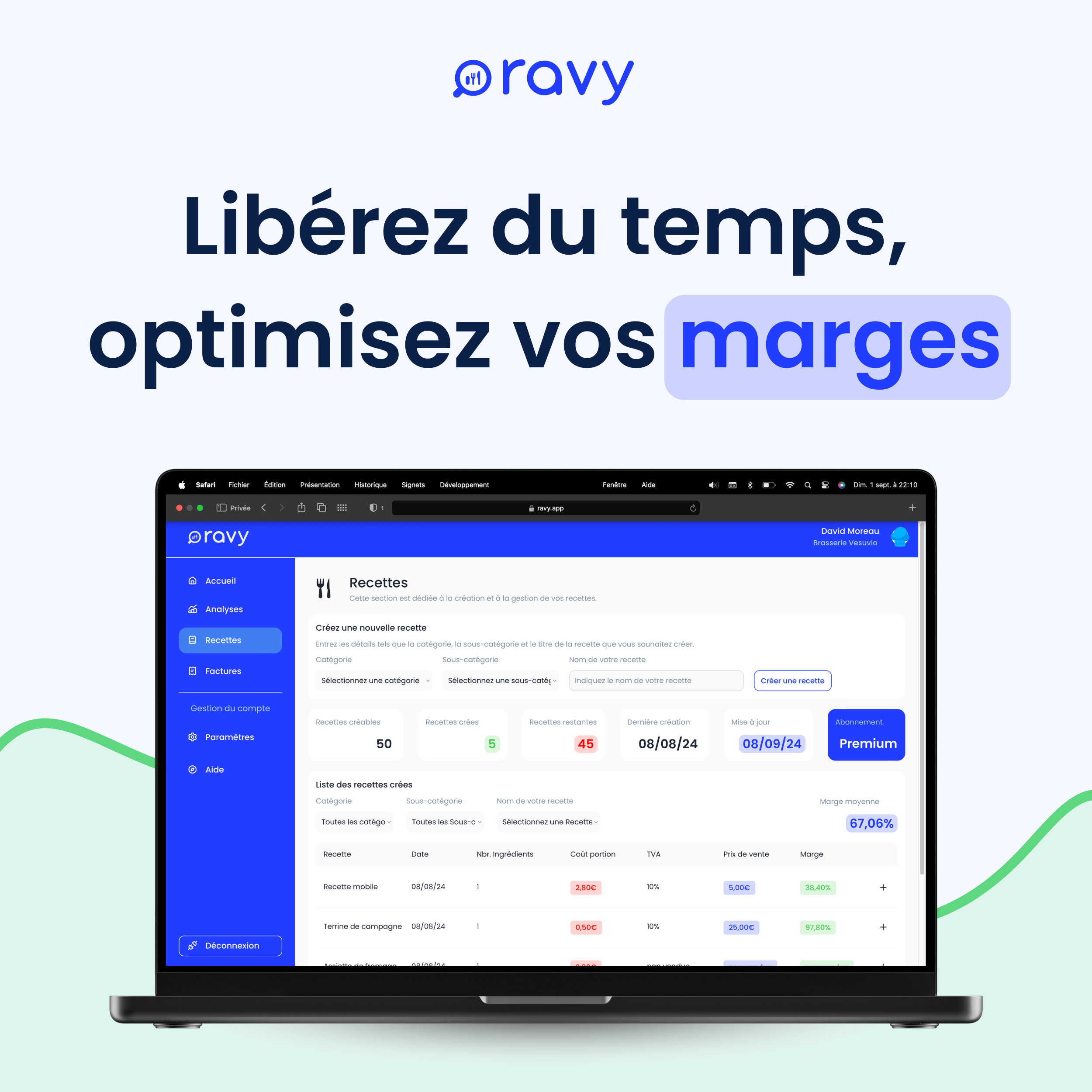 RAVY me permet de suivre en temps réel les marges de mes recettes grâce à leur analyse de facture ultra efficace. Je gagne maintenant plusieurs heures de travail par semaine et je peux enfin contrôler mes achats à 100%. Je recommande !