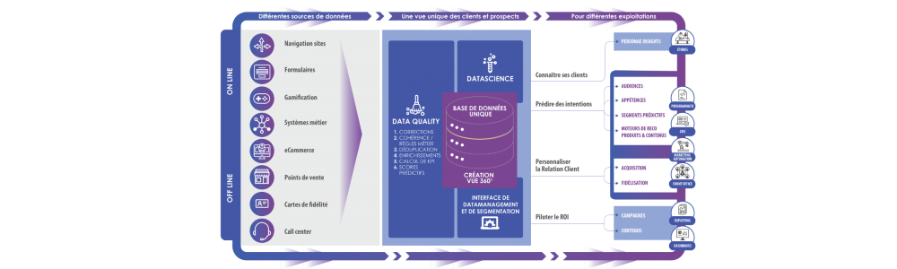 Alors, comment faire pour optimiser son Marketing et exploiter toutes ses données ? La Customer Data Platform (CDP) répond à ce besoin. Elle permet d'unifier toutes les données à caractère personnel : On et Off line, coordonnées, consentements, transactions, navigation/cookies, retour de campagnes, indicateurs calculés décrivant vos clients et vos prospects.