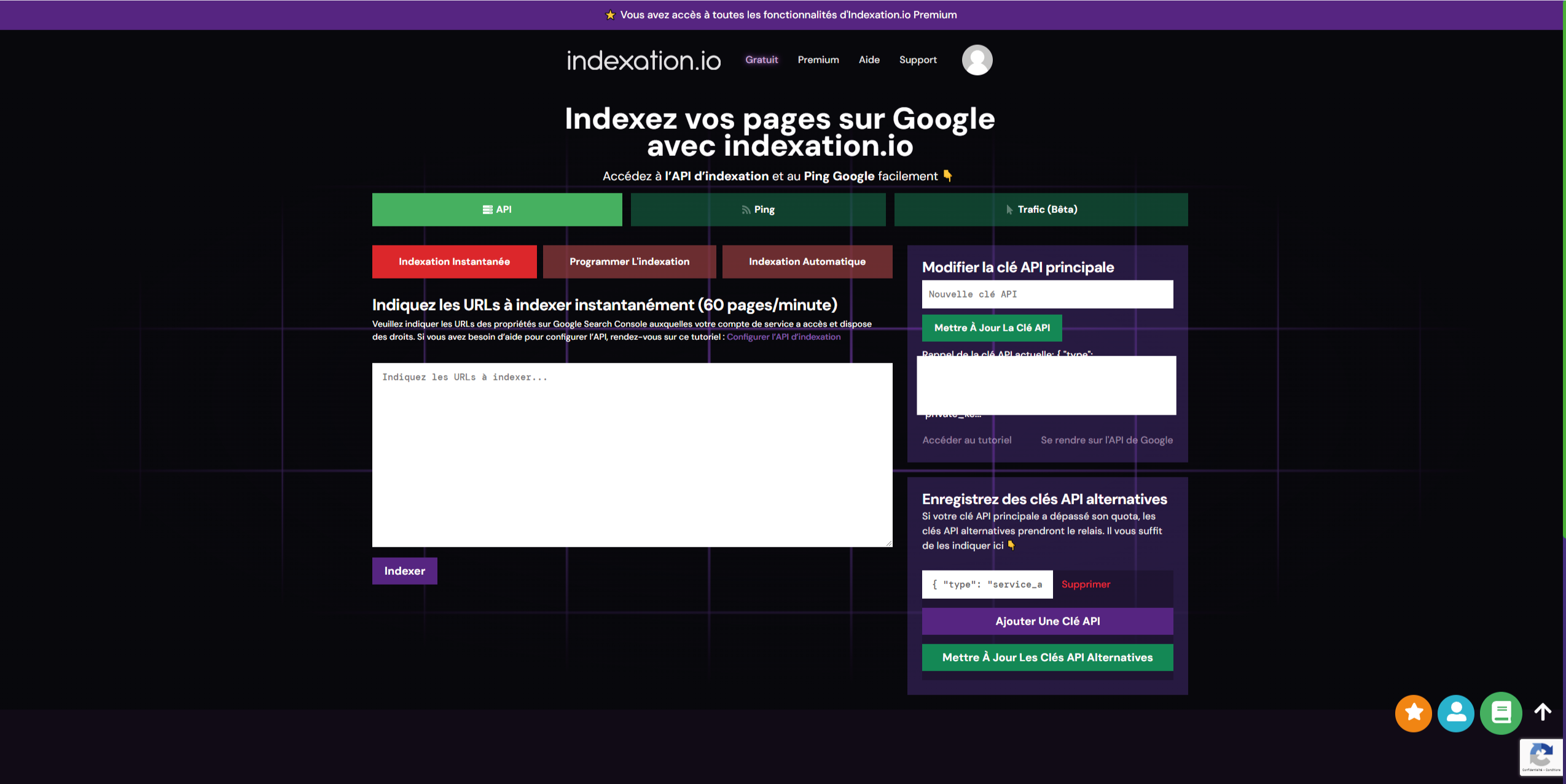 Débloquez toutes les fonctionnalités avec Indexation.io Premium et gagnez un temps précieux dans l’indexation de vos URLs.