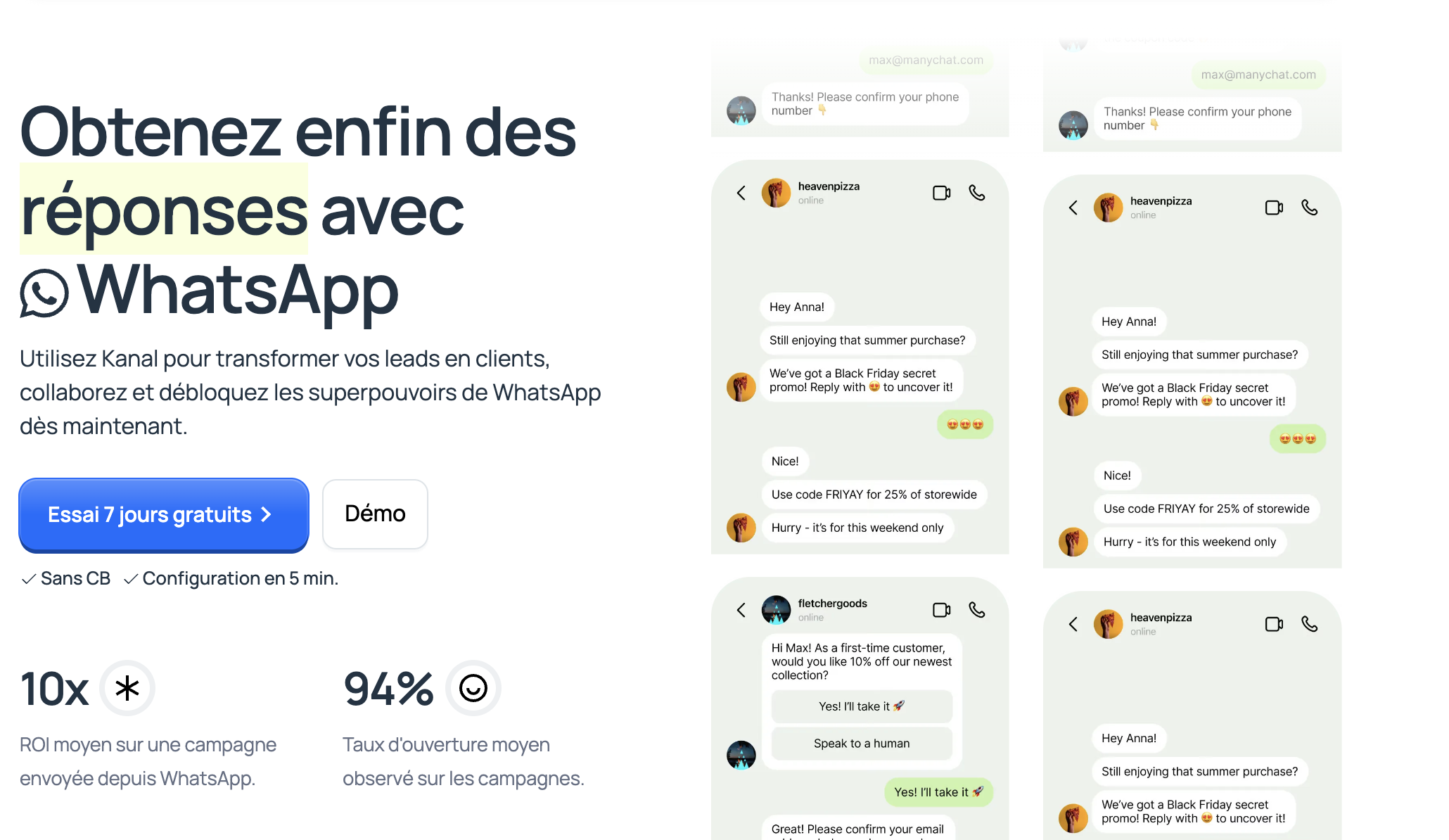 Kanal permet aux entreprises d'automatiser les échanges avec leurs clients sur WhatsApp, garantissant ainsi des réponses rapides et personnalisées.