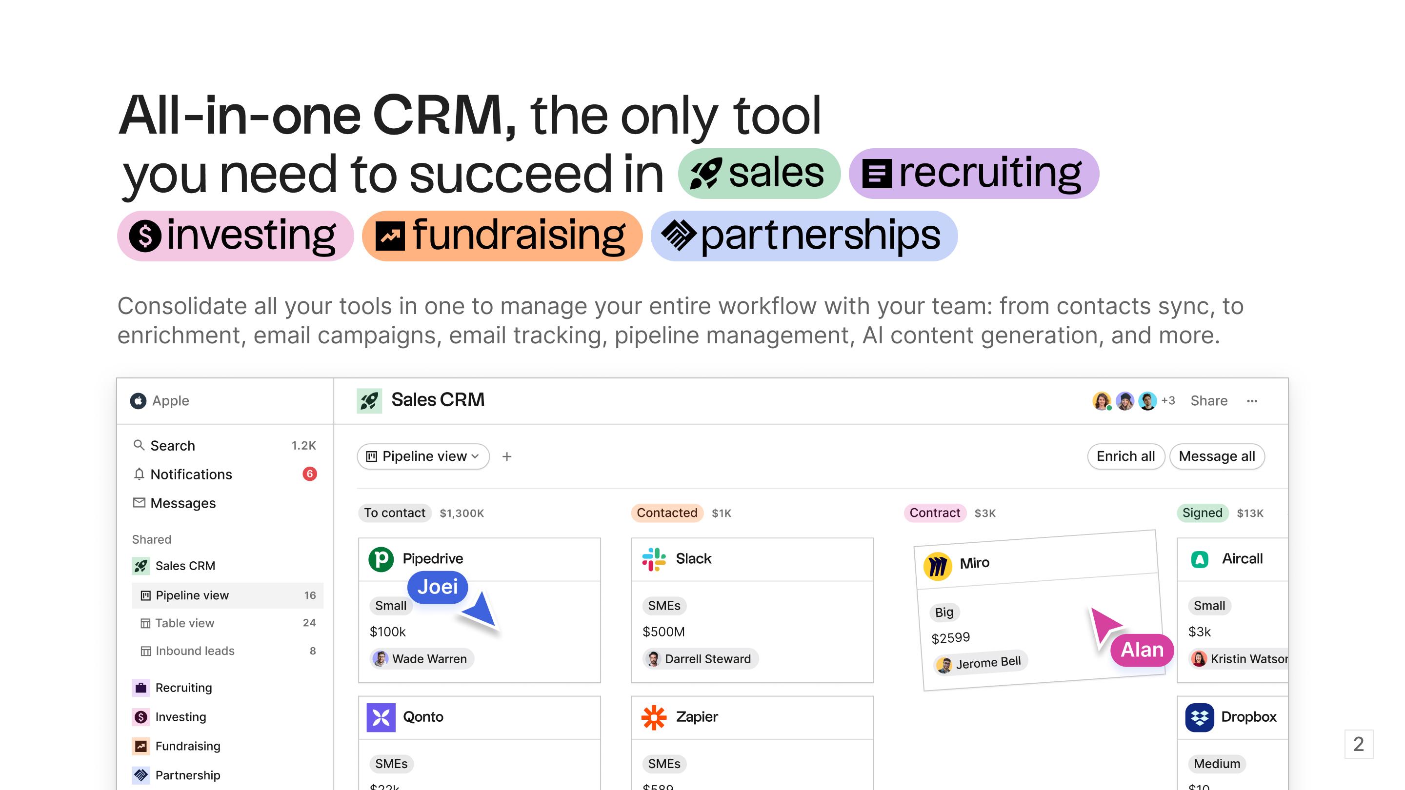 centralisation des contacts depuis diverses sources (email, LinkedIn, Google Calendar, etc.),