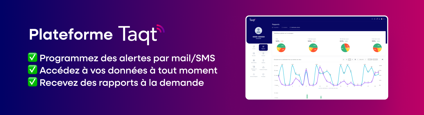 Ensemble, la Plateforme Taqt et la Borne Smiley offrent une solution intégrée pour surveiller, analyser et améliorer la satisfaction client tout en optimisant la gestion de vos services de nettoyage.