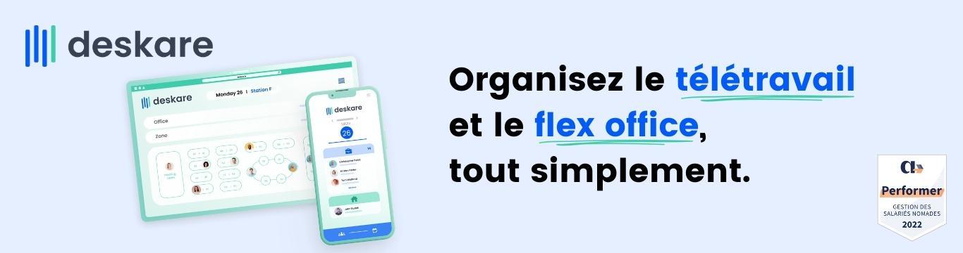 Deskare est un logiciel de gestion délivré en mode Saas, à destination des RH et Office Managers, permettant la gestion du télétravail et du flex-office.