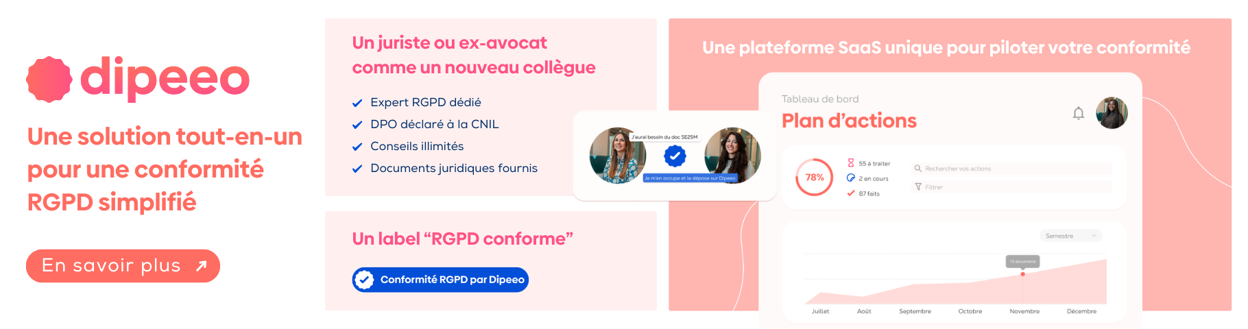 Dipeeo est une solution SaaS spécialisée dans la mise en conformité au RGPD pour les entreprises de toutes tailles. Grâce à un accompagnement personnalisé par des juristes experts, la plateforme automatise jusqu'à 80 % des tâches administratives liées au RGPD. En se déclarant DPO auprès de la CNIL, Dipeeo prend en charge l’ensemble des obligations légales pour ses clients.